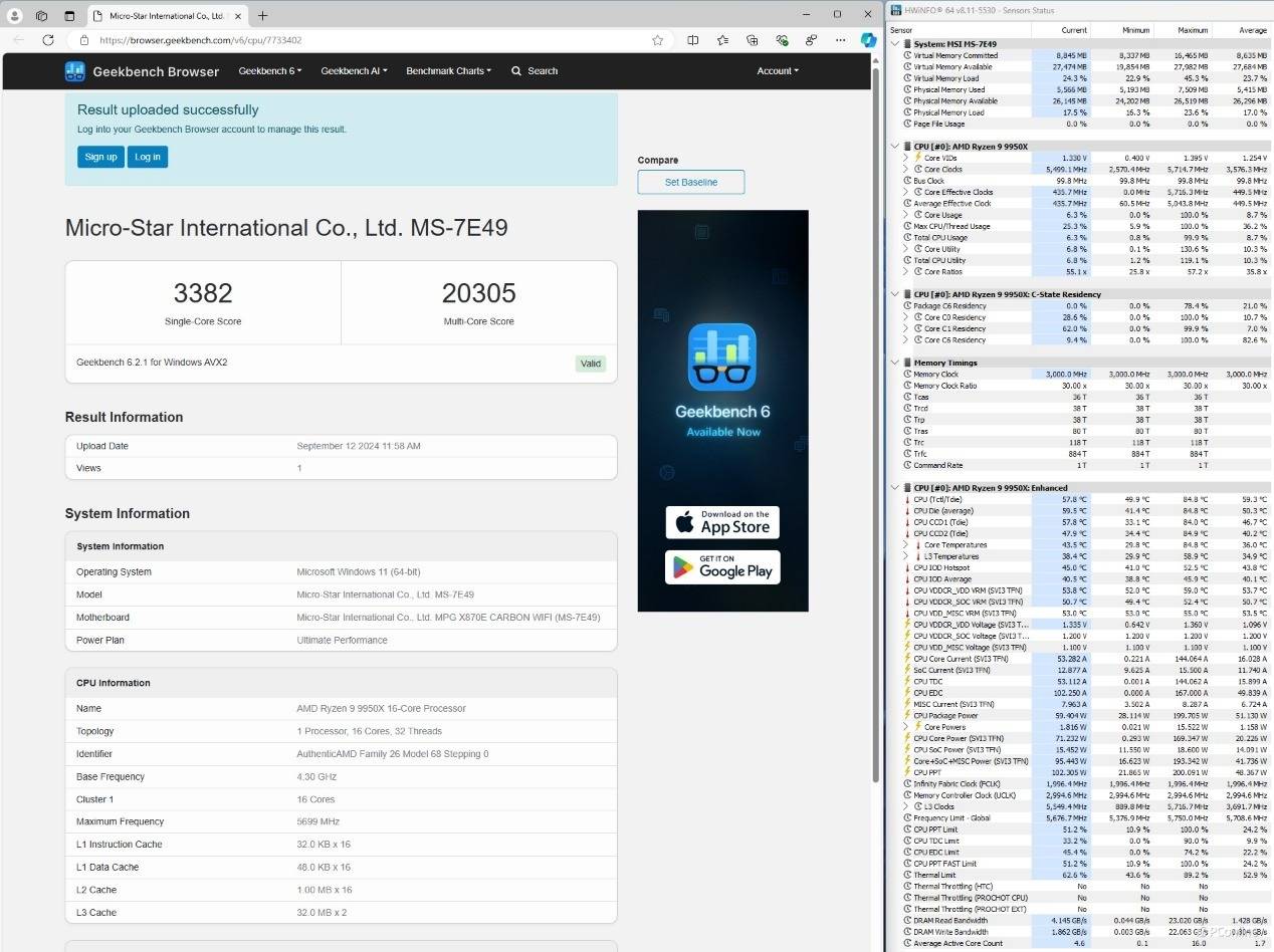 我们再看看一款熟悉的软件——GeekBench,大家在手机评测中应该经常见到,不过它也可以用于衡量桌面端处理器的单核/多核性能。我们用最新版本实测R9-9950X的单核为3382,多核为20305,性能表现不错。