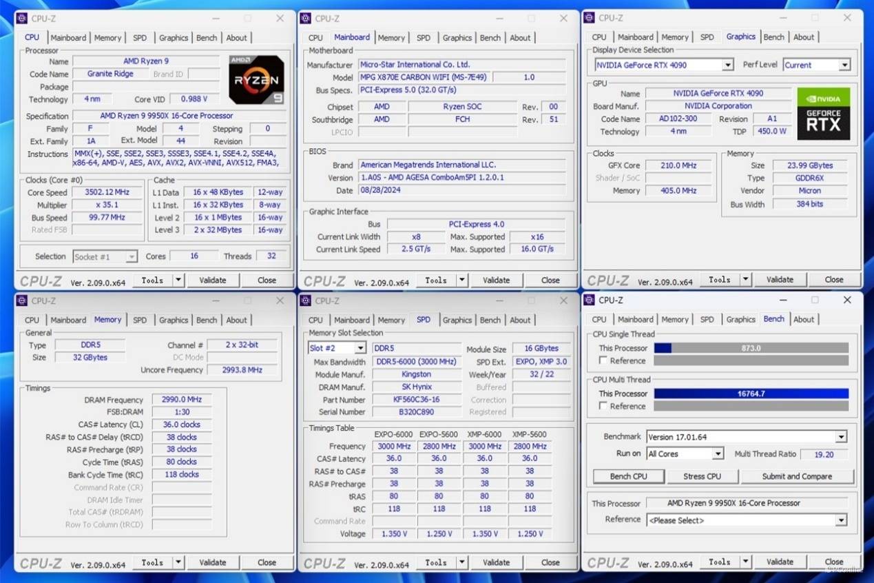 理论测试部分,首先上场的是大家熟悉的CPU-Z,这里不仅可以看到所有硬件信息,还能对处理器进行一定的性能测试。从下图可知,R9-9950X支持DDR5内存,此次测试内存运行在6000MHz Gear2模式下。除此之外,显卡则是普普通通的RTX 4090,想必没有人会怀疑这套平台的性能表现。最重要的CPU基准测试我们也进行了,实测R9-9950X跑出了单核873,多核16764.7的成绩,你可能对这个成绩没有概念,它再单核性能上能够比14900KS强10%左右!