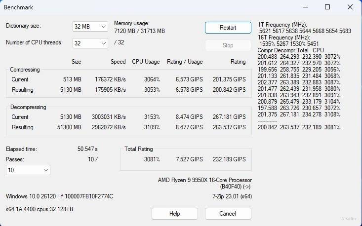 接着是7-ZIP的解压缩测试,压缩时这套平台的速度为175905 KB/s,而解压则能达到2962072 KB/s,总评成绩部分,CPU使用率为3081%、总体评分为232.189 GIPS,整体性能表现自然也是超越了隔壁最顶级的i9。