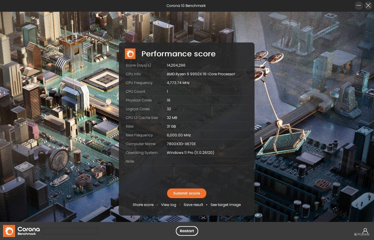 Corona的CPU渲染测试里,R9-9950X搭配微星MSI MPG X870E CARBON WIFI暗黑主板,成绩同样出众。测试过程里,16核32线程马力全开,CPU频率直接稳定在4.8GHz上下,实测成绩为14204296 ray/s。