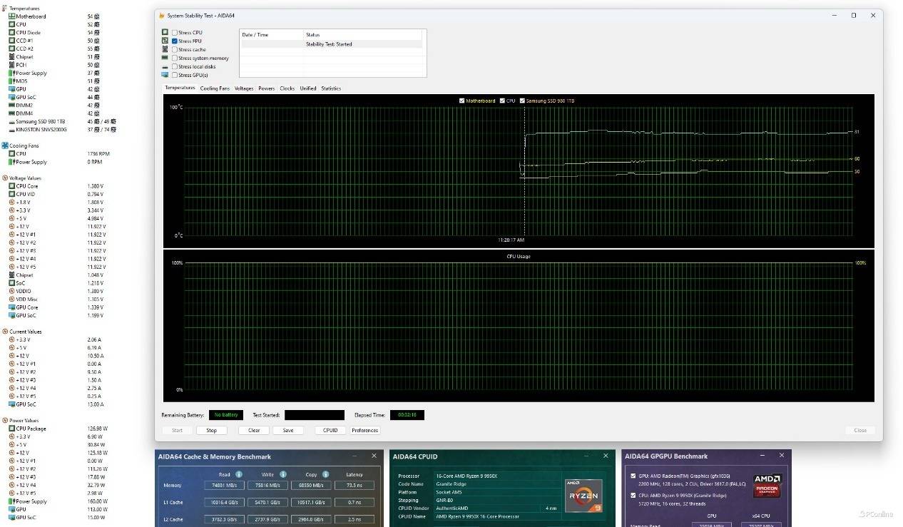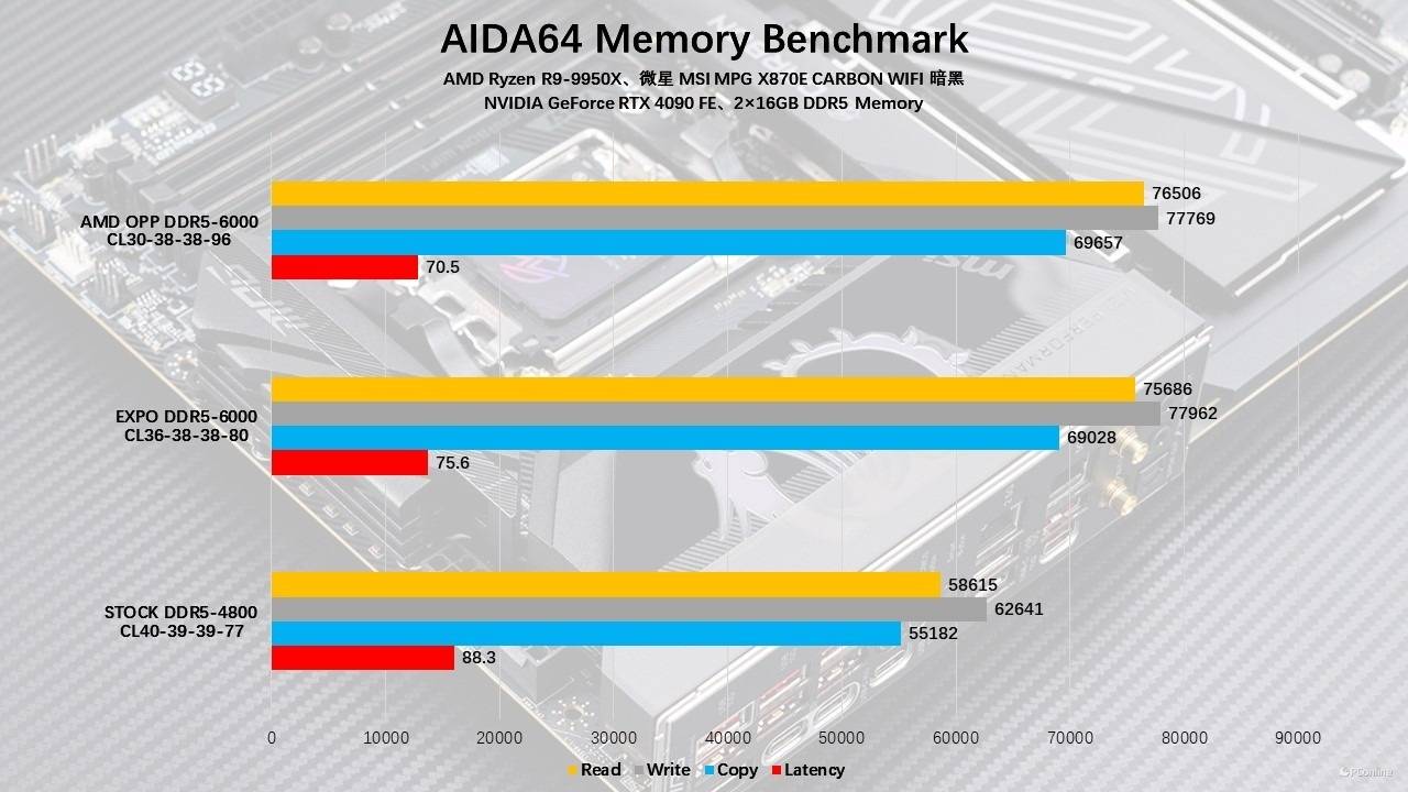 因为锐龙7000或锐龙9000处理器的内存甜点频率在6000MHz左右,因此这里我们也是开启了EXPO设定,将内存超频至DDR5-6000MHz C36。此时读取75686 MB/s,写入77962 MB/s、复制69028 MB/s,甚至延迟也不错,仅75.6ns。