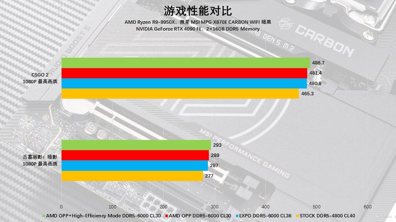游戏部分的话,AMD OPP预设遇上DDR5-4800MHz则是全面碾压,性能大致要领先5%左右,对比EXPO DDR5-6000MHz的话,帧数也有稍微涨幅。
