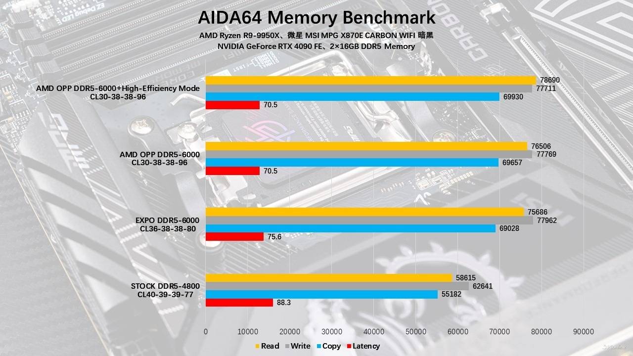 实测相比较于仅开启AMD OPP功能的性能,AMD OPP+High-Efficiency Mode的设定下,内存性能能够进一步增强,此时内存的延迟也比默认4800MHz降低了20%左右。当然,我们是用Auto档位测试的,如果你的内存性能足够强势,完全可以选择最强的Tightest,性能还会有提升。