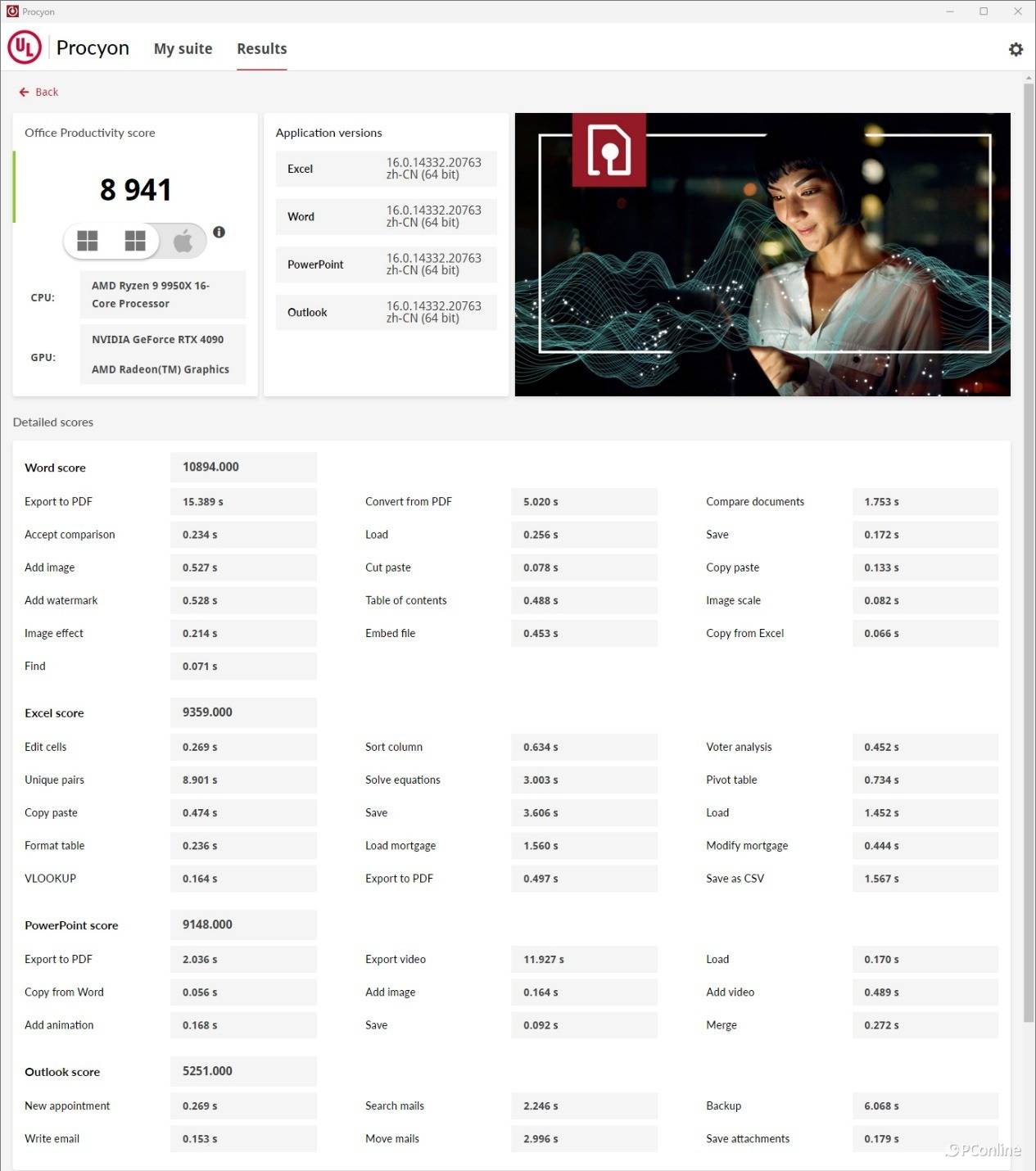 首先看到的是办公软件的测试,实测总分8941分,子项目得分分别是Word 10894分、Excel 9359分、PowerPoint 9148分以及Outlook 5251分。应该没有人会质疑旗舰级CPU对Office的处理能力吧~