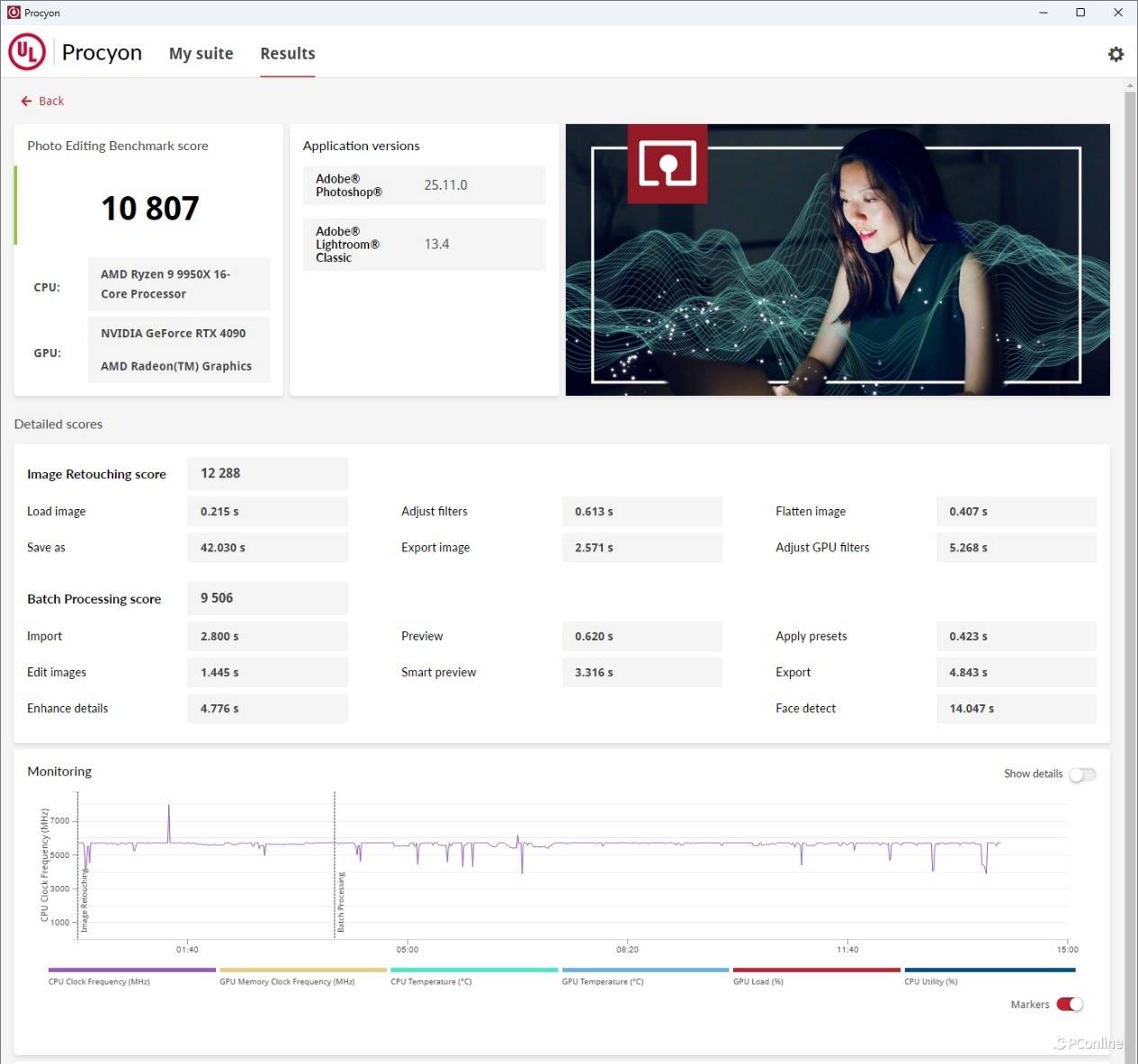 第二项是图像编辑测试,这个项目会用到PS以及LR这种比较吃CPU性能的软件,R9-9950X配微星MSI MPG X870E CARBON WIFI暗黑主板可以说是丝般顺滑,完全能够释放应有的性能,实测得分10807。