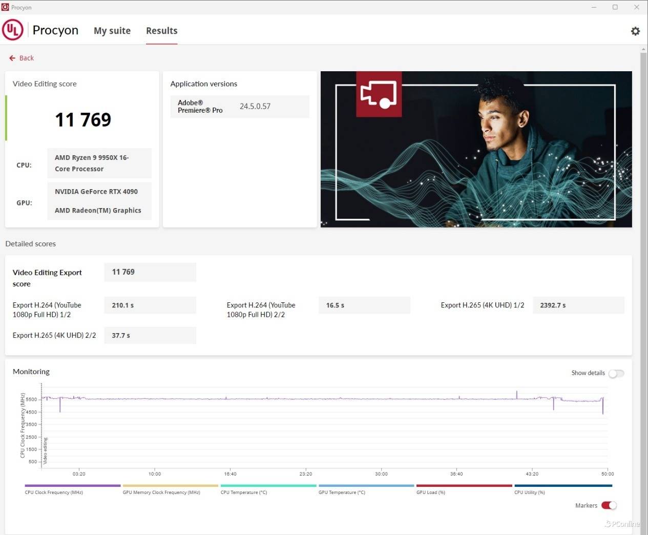 压力更大的视频剪辑测试里得分11769,这也充分说明它的性能相当优越,微星MSI MPG X870E CARBON WIFI暗黑主板不错的平台基础,让R9-9950X以及RTX 4090有了绝佳的发挥空间,能够胜各种创作生产力需求。