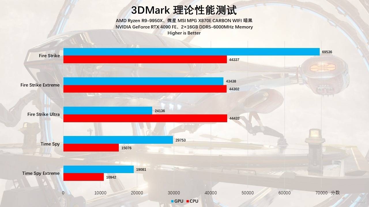 不过游戏玩家自然关心微星MSI MPG X870E CARBON WIFI暗黑主板搭配地表最强的R9-9950X能够有怎样的游戏性能表现。测试前先让我们用3DMark对平台进行测试,实测这套平台在各项测试里可谓神勇!Fire Strike系列测试里,CPU的得分均在44000分以上。即便是Time Spy系列测试里,R9-9950X也有出众的表现。