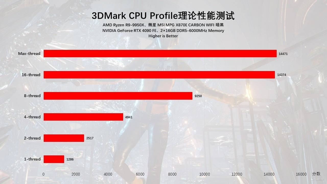 再来是3DMark CPU Profile测试,这项测试可以更精准的测试CPU在单核与多核方面的性能表现,实测R9-9950X的单线程分数为1286,最大线程分数为14471,表现不错,妥妥的旗舰级表现,这个成绩已经完全能够满足极客玩家的需求了。