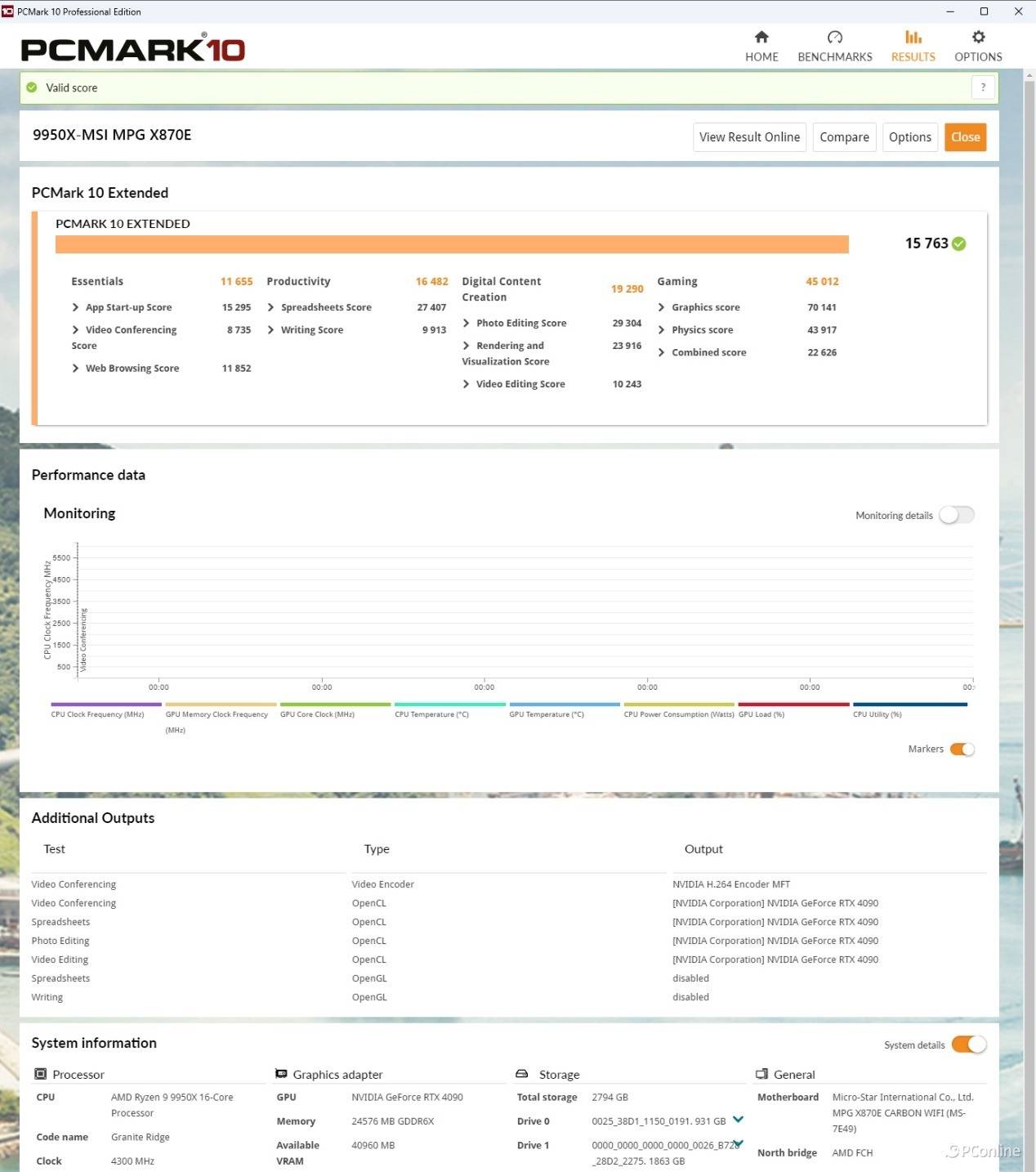 从实际成绩上看,这套平台的表现还是相当优越的,总分有15763,其中常用基本功能11655分,生产力16482分,数位内容创作19290分,游戏45012分。要说这最出色的还是游戏体验,比自家的7800X3D还要高。所以,最近想换游戏主机的真的可以考虑一下,R9-9950X处理器加上微星MSI MPG X870E CARBON WIFI暗黑主板这套配置,可以很好地胜任日常娱乐及办公体验,同时还能兼顾出色的创意创作工作。