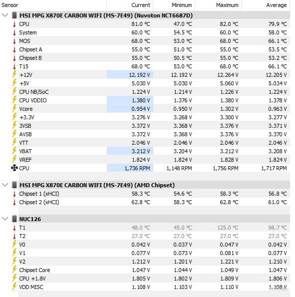 实测R9-9950X稳如老狗,全程FPU测试都没有出现过热降频的现象,并且温度控制得也比较到位,HWINFO64中显示微星MSI MPG X870E Carbon主板CPU处的最高温度为81℃,MOS温度则是68℃,底下南桥的温度就更低了,只有55℃。
