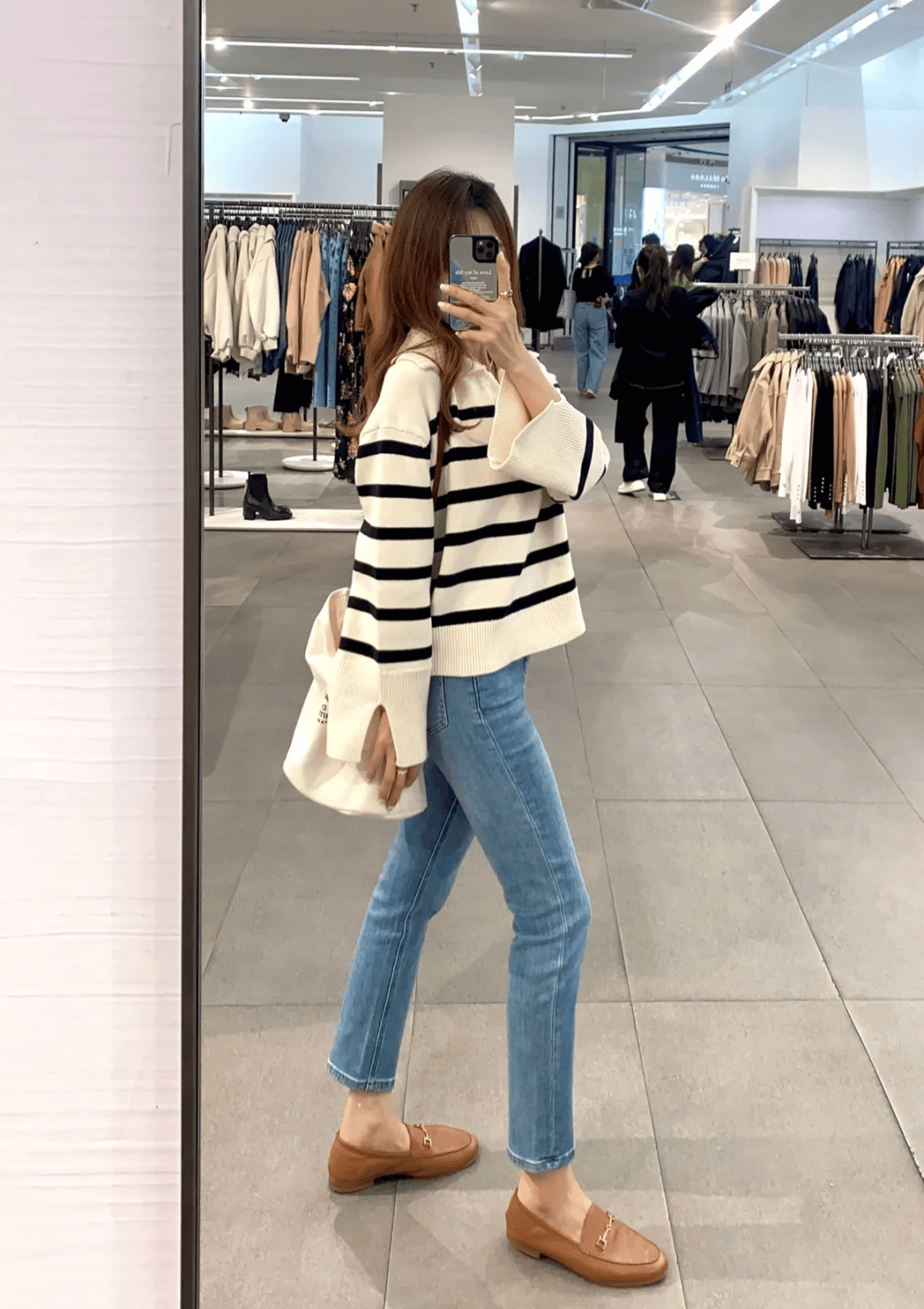 - 街拍:牛仔裤好看又百搭,搭配一字肩上衣很经典,百搭时尚