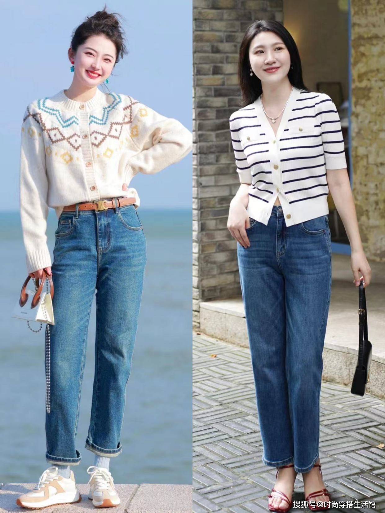 - 街拍:牛仔裤好看又百搭,搭配一字肩上衣很经典,百搭时尚