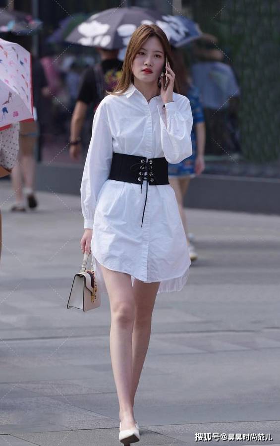 — 夏末初秋的时尚穿搭,白色长款衬衫裙加上黑色腰封,搭配干练利落 —