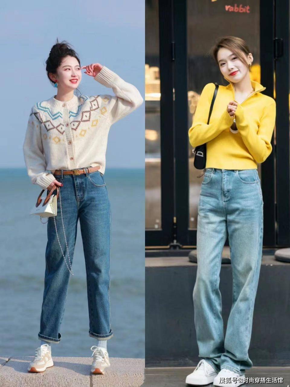 - 街拍:牛仔裤好看又百搭,搭配一字肩上衣很经典,百搭时尚