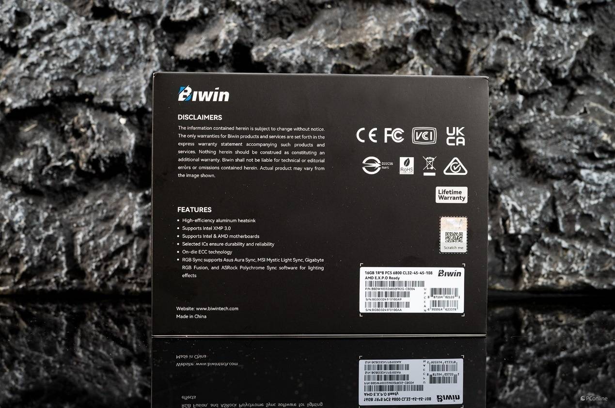 包装的背面就比较简约了,密密麻麻标注了内存的各项信息,如时序、支持 XMP 3.0、 EXPO以及ON-Die ECC纠错等。