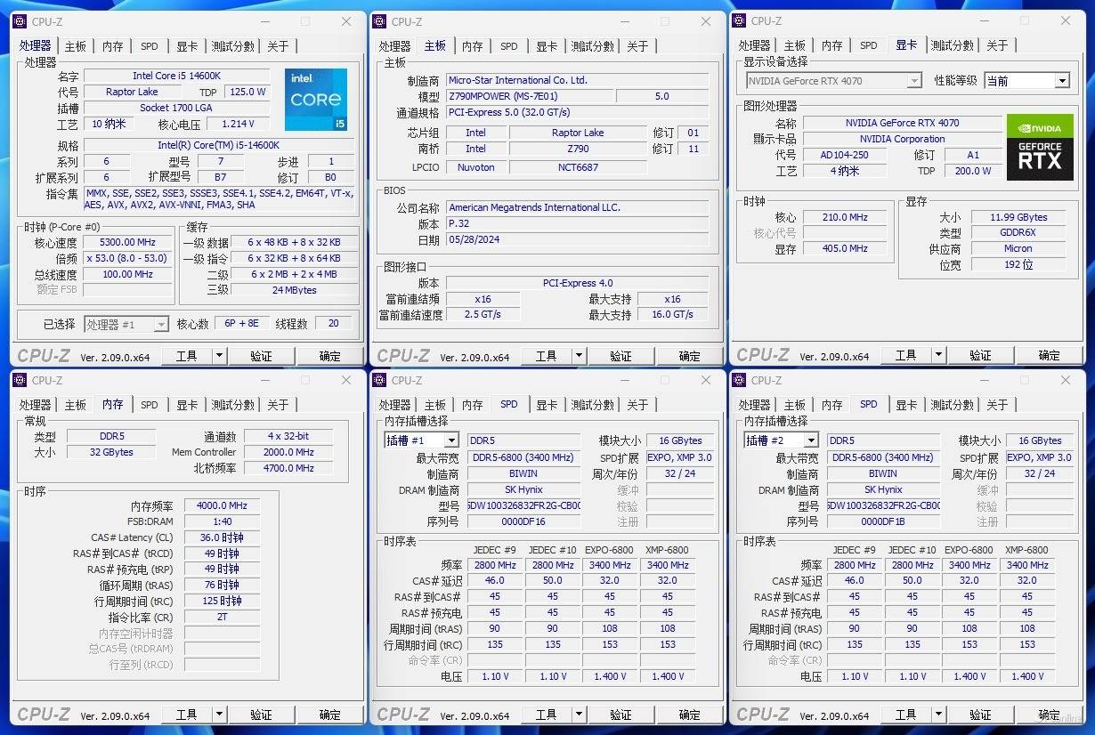进系统以后,我们再用CPU-Z验证一下。从下图可以清楚的看到,CPU、主板以及显卡都与上面的介绍一一对应。而佰维DW100 时空行者 DDR5 RGB电竞内存的信息也一目了然,默认状态开机的话频率则是5600MHz,时序为46-45-45-90,电压1.10V。追求性能的则可以开启XMP或EXPO档位,频率都是6800MHz C32-45-45-108。