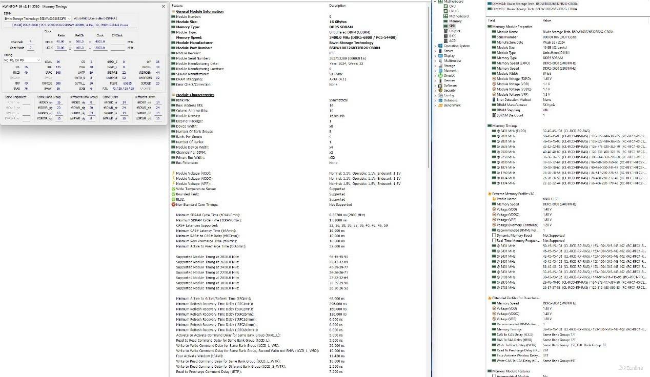 除此之外,我们还可以打开AIDA64以及HWINFO64,这里有更多关于佰维DW100 时空行者 DDR5 RGB电竞内存的信息。图中显示,这款内存搭载的正是海力士原厂高性能A-die颗粒,它就是DDR5时代的超频代名词。另外,图中还展示了内存颗粒是2024年8月左右生产的,新鲜出炉。