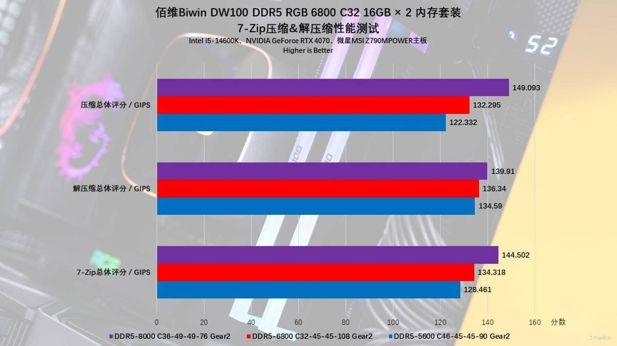 如果你手动超频至8000MHz,那你会发现性能飙升得更离谱!实测8000MHz下,整体得分就来到了144.502 GIPS,相比XMP档位,性能又上涨了7%,对比默认5600MHz的话就更不用说了,看图就知道差了一大截。细看子项目,对比压缩的表现的话,那上涨性能幅度更加夸张,足足比XMP档强12%,比默频强22%,这个幅度确实夸张。