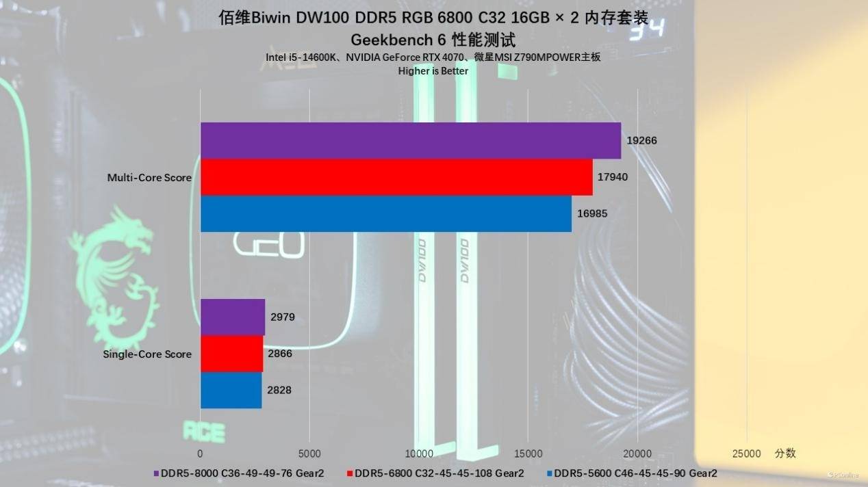 真性能暴涨还得看手动超频,我们将内存频率超到8000MHz后,单核再度涨了约100分,多核成绩就离谱了,直接跨幅度来到了19266分。这么说你可能不直观,说人话就是手动超频到8000MHz后,性能比默频强13%左右,性能相当强势。