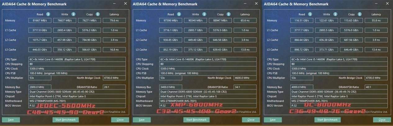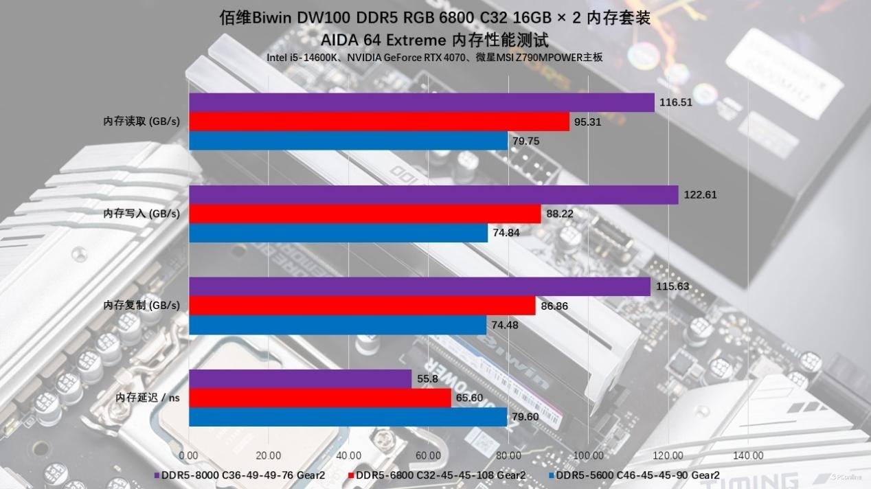 紧接着就是AIDA 64的Memory Benchmark,它可以更直观的反应不同频率下内存的性能释放。实测JEDEC-5600MHz时,佰维DW100 时空行者 DDR5 RGB电竞内存的读取、写入、复制以及延时成绩分别为81667 MB/s、76637MB/s、76271 MB/s以及79.6 ns;开启XMP-6800MHz后,配合C32的超低时序,此时读取、写入、复制等性能有了一定的提升,读取、写入、复制以及延时成绩分别为81667 MB/s、76637MB/s、76271 MB/s以及79.6 ns。
