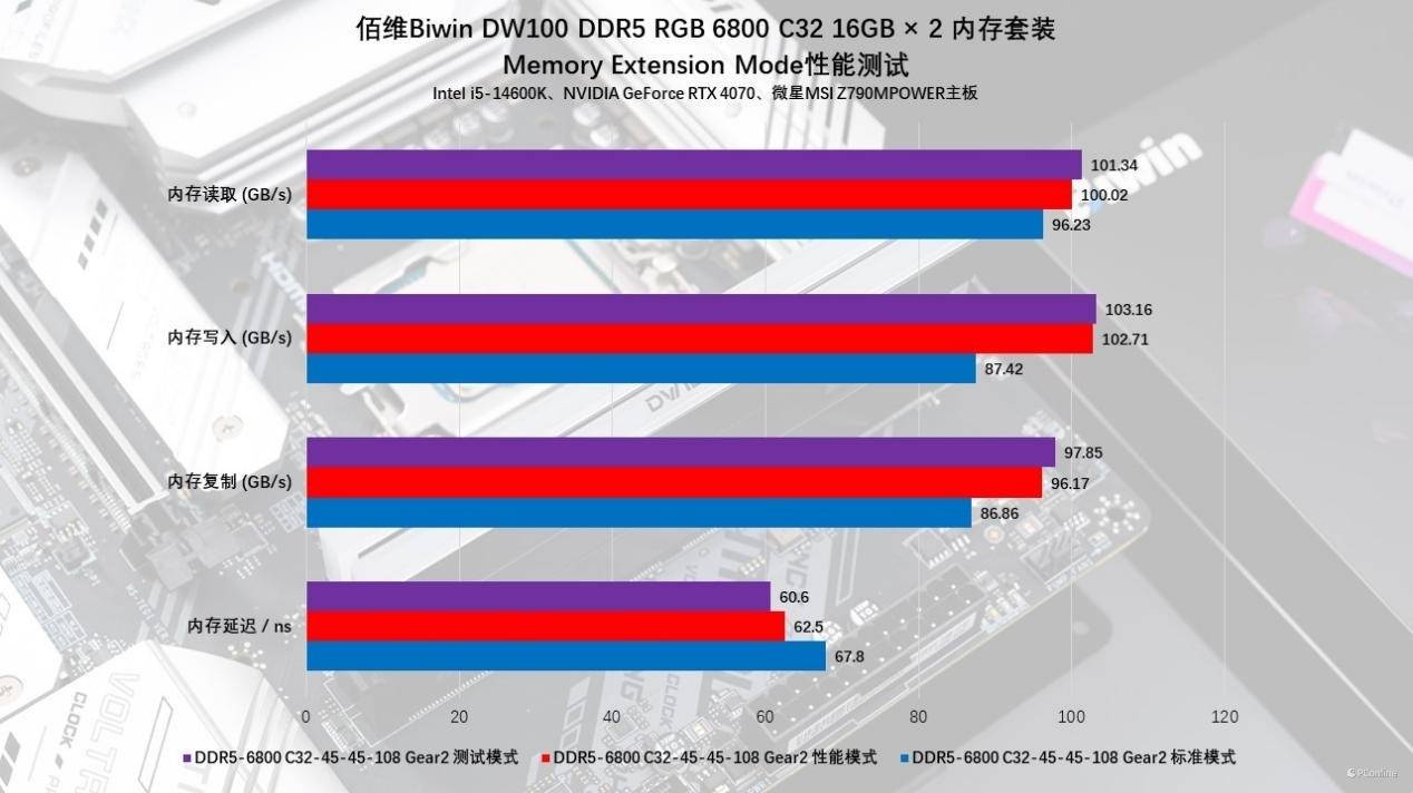 实测开启Memory Extension Mode后,内存性能确实有肉眼可见的提升,特别是写入与复制方面。未开启的情况下,XMP-6800MHz下,佰维DW100 时空行者 DDR5 RGB电竞内存的写入为89523 MB/s,开启Performance模式后,写入已经可以冲到102.71 GB/s了,提升15%以上;如果开到最强的Memtest模式,那写入性能还能再涨到103.16 GB/s。除此之外,读取性能也来到了101.34 GB/s,相比默认XMP,涨幅也有5%以上。
