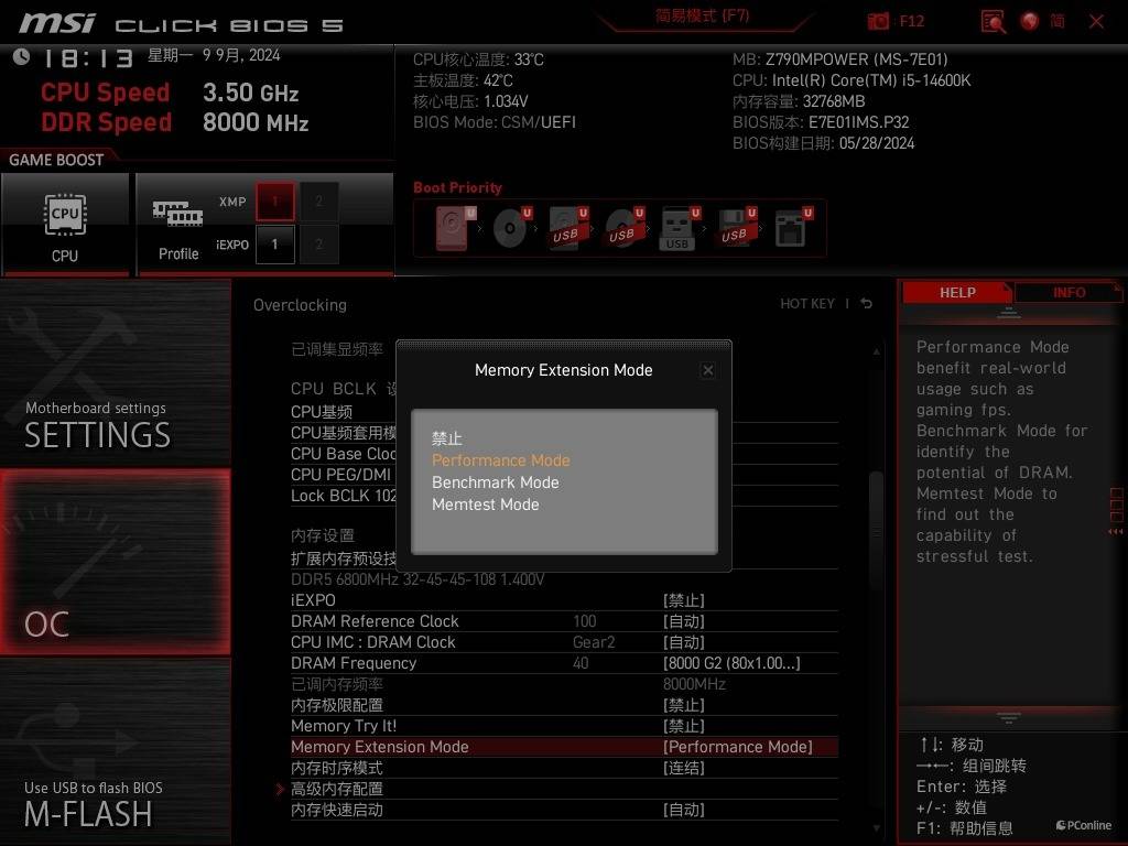 值得一提的是,我们上面提到微星Z790MPOWER主板还有“黑科技”,Memory Extension Mode功能。开启这项功能能够让DDR5内存性能更上一层楼,你只需要在BIOS的高级设置-OC菜单中就能找到。这个Mode有三种模式,分别是Performance Mode、Benchmark Mode以及Memtest Mode,可以形象的认为是一、二、三档,档位越大对于内存的调整会越猛,性能也越强。
