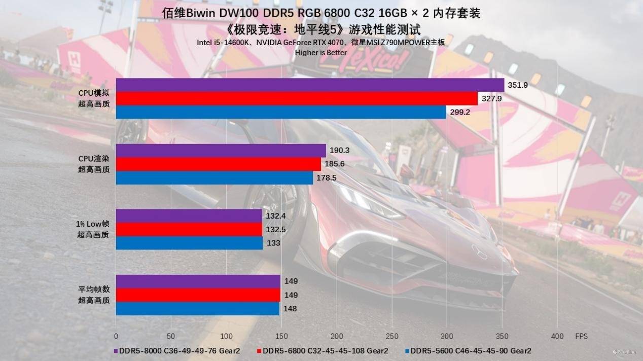 内存对游戏也有影响吗?首先测试的是《极限竞速:地平线5》,在内存频率是默认的5600MHz的时候,测试出的CPU模拟平均帧数是299.2,CPU渲染平均帧数是178.5;而内存频率提升到8000MHz的时候CPU模拟平均帧数是351.9,CPU渲染平均帧数是190.3。从299.2到351.9,提升15%。从178.5到190.3,提升7%,提升非常明显了。