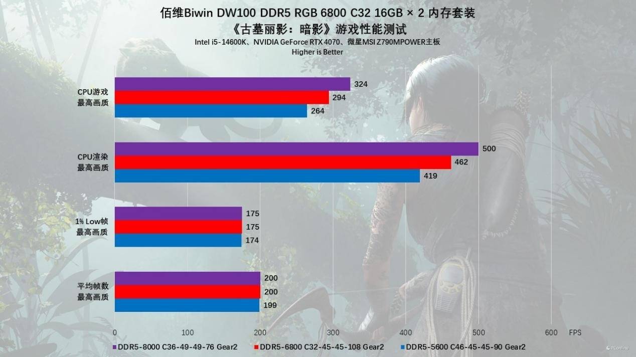接下来看《古墓丽影:暗影》,它的Benchmark中很好的显示出CPU对显卡性能释放的影响。实测1080P最高画质下,随着内存频率的增长,CPU游戏和CPU渲染值都有较大的提升。5600MHz下,CPU游戏与CPU渲染分别为264 FPS和419 FPS,而手动超频至8000MHz后,这两个数值上涨至324 FPS与500FPS,涨幅高达18%,可见内存频率的提升确实对帧数有实质性的影响。