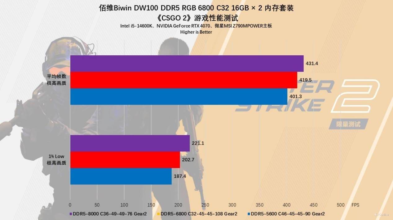 另一款网游《CSGO 2》吃内存频率就更明显了,实测1080P最高画质下,手动超频至8000MHz后,游戏平均帧率比默频状态要高30 FPS左右,1% Low的提升也很明显,直接上涨约40 FPS,整体游玩起来的体验就是,高频内存加持下更丝滑更稳定,即便遇到封烟的情况时,帧率也不会出现大幅度的波动,对枪的体验也更好。
