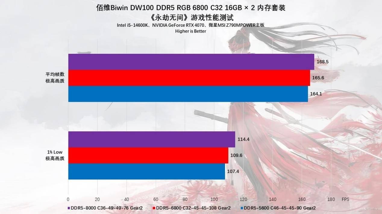 想必有不少玩家听说过网游吃内存频率,这里我们也进行了实机测试。首先上场的就是时下热门的《永劫无间》,实测1080P、全高画质下,内存频率越高,平均帧确实也会提升,不过最实际的还是1% Low帧的提升,1%Low越高,也就意味着你的游戏体验会更加丝滑,掉帧卡顿的情况会更少,8000MHz下1% Low帧已经接近120 FPS了,妥妥的高刷电竞体验。