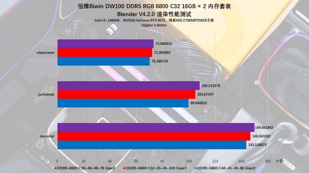 接着我们再看看渲染领域的表现,这里用的是渲染界的热门软件Blender,软件会自动渲染测试monster/junkshop/classroom共三个场景。实测随着内存频率的提升,三个场景的得分也水涨船高,实测手动超频到8000MHz以后,其性能表现明显要优于JEDEC-5600MHz,有的项目性能差距甚至超越了5%以上。