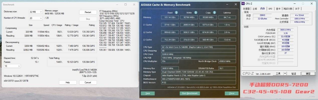 最后的测试就是喜闻乐见的超频潜力测试了~实测用XMP的参数进行超频,这套参数能够很轻松的冲上7200MHz,一次点亮轻轻松松,甚至7400MHz也没啥问题。实测7200MHz下,内存的读取、写入、复制成绩分别为101.14 GB/s、92766 MB/s以及93269 MB/s,7Zip的测试成绩也有不小的提升。