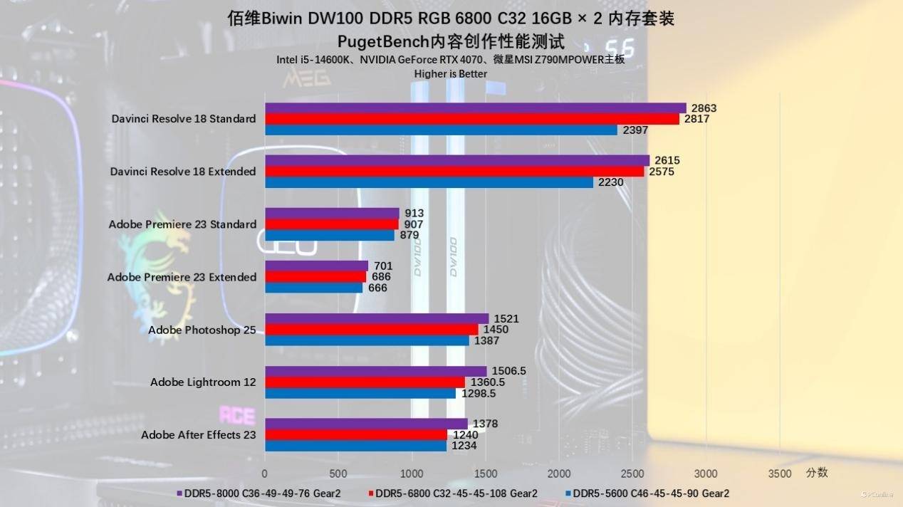 游戏性能大家都见识到了,那内存频率对创作性能又有什么影响呢?我们先测试大家最关注的图像编辑、视频剪辑部分,这里以PugetBench提供的脚本进行模拟测试,测试过程会模拟用户在Adobe、达芬奇中的真实操作,能够较为真实的反应内存频率对创作性能的影响。