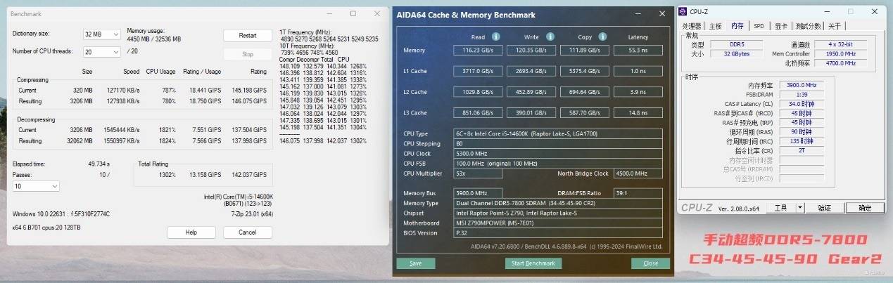 7800MHz也能用相同的时序点亮,佰维DW100 时空行者 DDR5 RGB电竞内存的超频潜力非同小可。此时内存的读取性能提升至116 GB/s,写入则直接来到了120 GB/s,复制性能也有111 GB/s,7Zip的基准测试表现同样出彩,特别是压缩项目,对比XMP-6800MHz足足涨了10%,达到了146.075 GIPS。