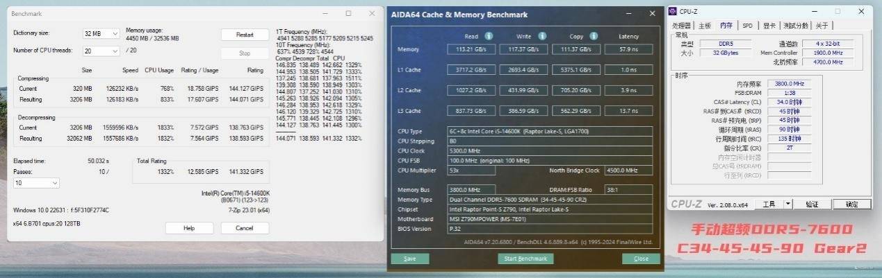 7600MHz就要稍微放宽一点点时序了,C34-45-45-90就能点亮,有一说一这个表现还是相当给力的。对比7200MHz的表现,AIDA64的提升是最明显的,此时无论是内存读取、写入还是复制都突破100GB/s,其中涨幅最大的还要属写入性能,涨幅高达23%,除此之外,延迟也降低到了60ns以内。