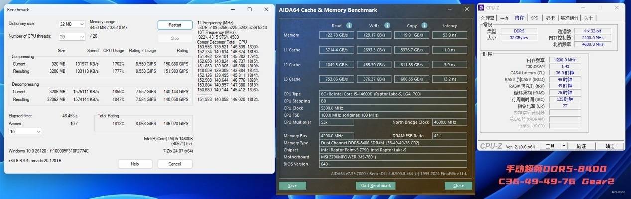 8200MHz用同款参数也能启动,这在以前是想都不敢想的。此时的内存性能分别是:读取119.18 GB/s、写入125.73 GB/s、复制117.89 GB/s、延迟56.6 ns,各项数据都再创新高!7Zip的表现也相当给力,整体性能相比默频的128 GIPS提高了整整10%,达到了144.994 GIPS,极致的超频潜力带来了强悍的性能释放。