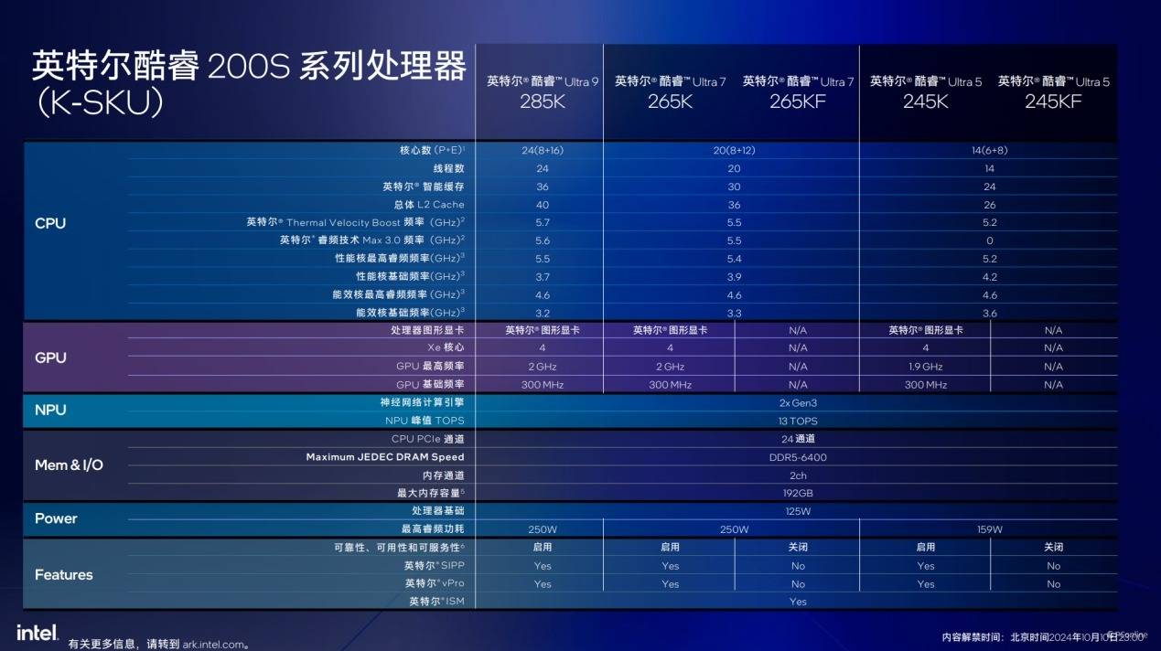 从这份英特尔官方给出来的PPT截图可看到,酷睿Ultra 200S处理器首批上市的仍是“K”与“KF”后缀不锁倍频的处理器,K与KF之间的差别在于是否带上新一代GPU核心。酷睿Ultra 9 285K、酷睿Ultra 7 265K,与酷睿Ultra 5 245K除了核心数量、核心频率、缓存系统,以及最高睿频功耗不相同之外,其他单元均相同。而酷睿Ultra 7 265KF与酷睿Ultra 5 245KF虽然不带核心,但独立的NPU单元仍是具备的。