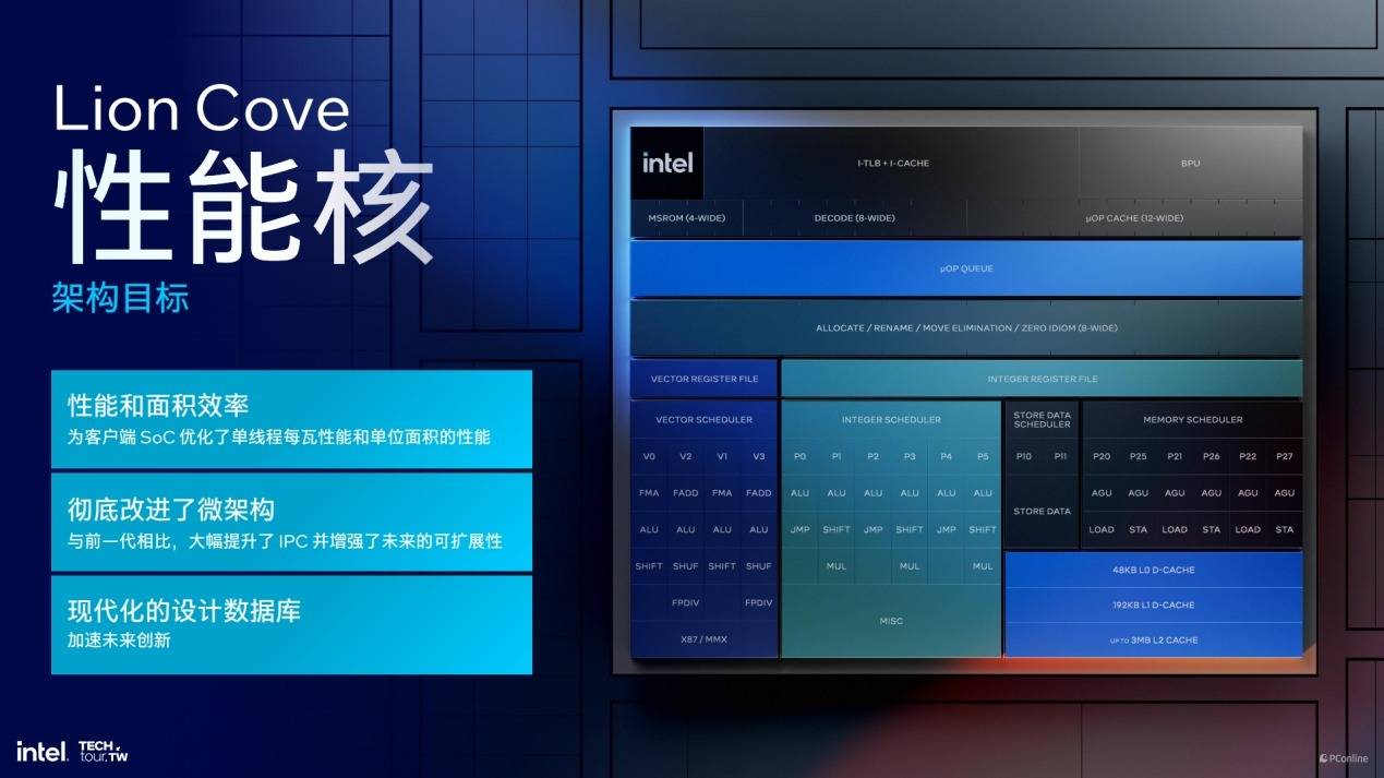 从上面的架构图里可以看到Lion Cove的缓存结构改动很大,Lion Cove使用了全新的多层数据缓存设计,在L1数据缓存与L2缓存之间加了一层缓存,缓存的主要作用是临时存储CPU可能需要快速访问的预取数据,更大更多的缓存是为了避免因为RAM的限制而造成CPU的性能瓶颈,特别是在处理像游戏等特定任务时尤为明显。