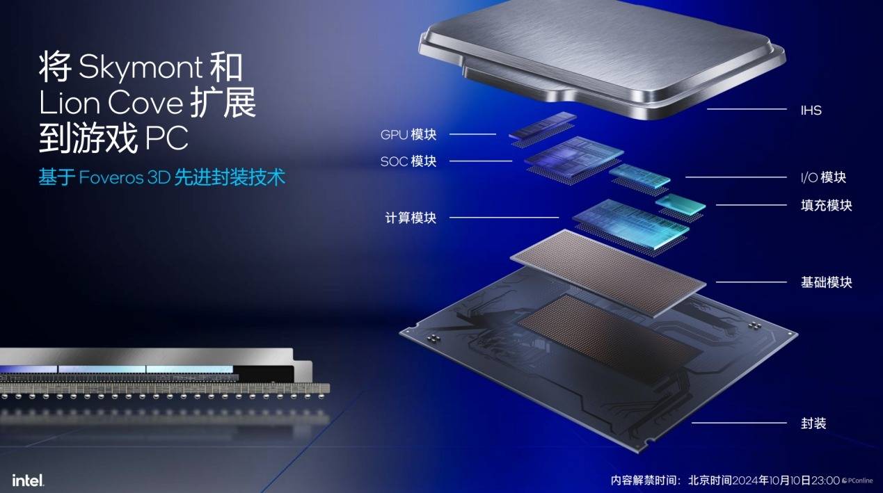 众所周知,Meteor Lake开创了英特尔模块化设计的先河,前段时间发布的Lunar Lake延续了Meteor Lake的模块化设计。全新推出的英特尔酷睿Ultra 200S系列处理器也采用了分离式模块化设计,整体为4个主要模块,包括计算模块、SoC模块、GPU模块、I/O模块以及我们在Lunar Lake上见过的填充模块,多个模块再通过英特尔先进的Foveros 3D技术连接到基础模块之上。