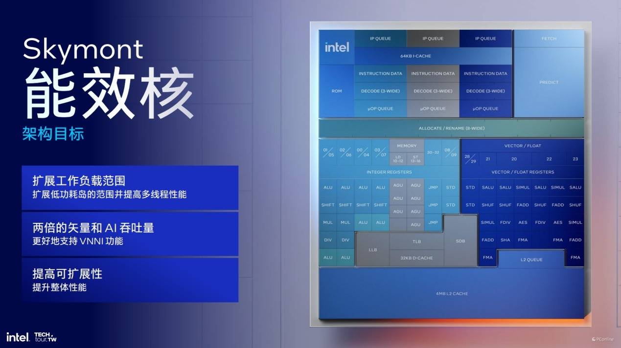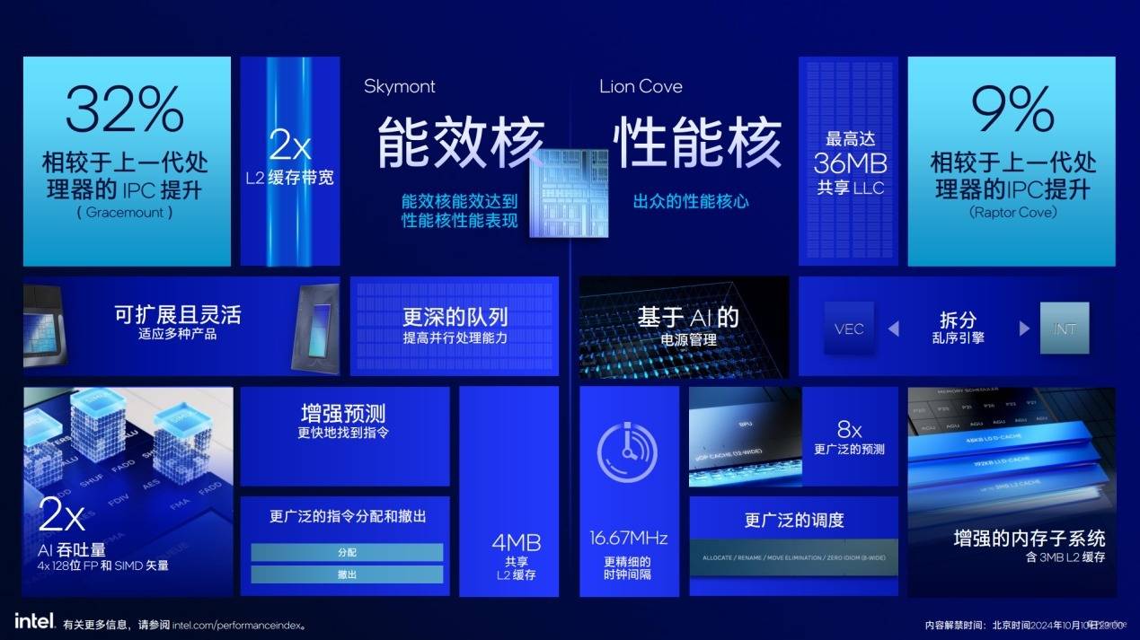 当然,刚才我们已经说到 E核有着较大的性能提升,主要是由Alder Lake的Gracemont微架构升级为了最新的Skymont微架构,IPC提升更是逆天,直接来到了32%。甚至全新基于Skymont架构打造的E核在性能上丝毫不输Raptor Lake-S的Raptor Cove P核,部分工作场景下性能表现更胜一筹。