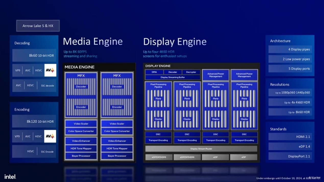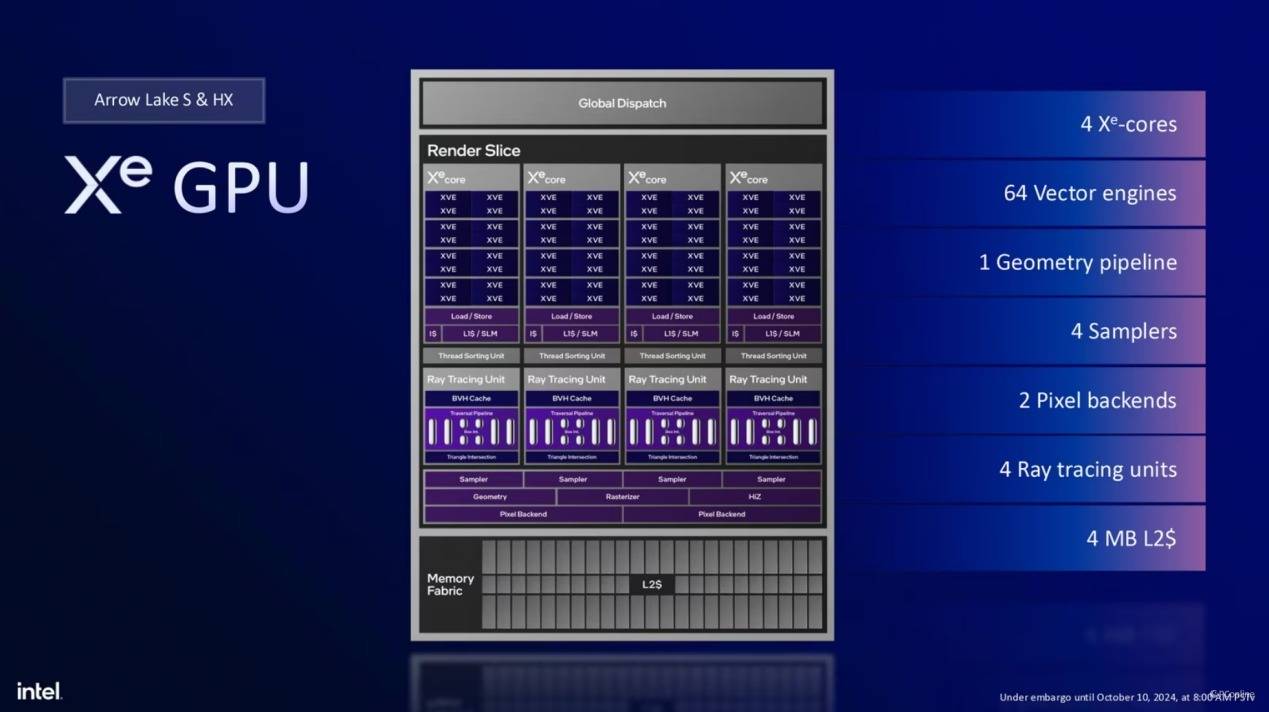 除此之外,它还集成了高性能独显的所有核心特性,如硬件光追单元的加持、对于DP4A人工智能加速引擎的支持,以及Intel XeSS的支持等。不过由于XMX引擎的缺失,所以XeSS的效率是肯定没A系列独显以及Lunar Lake上的核显那么高的。