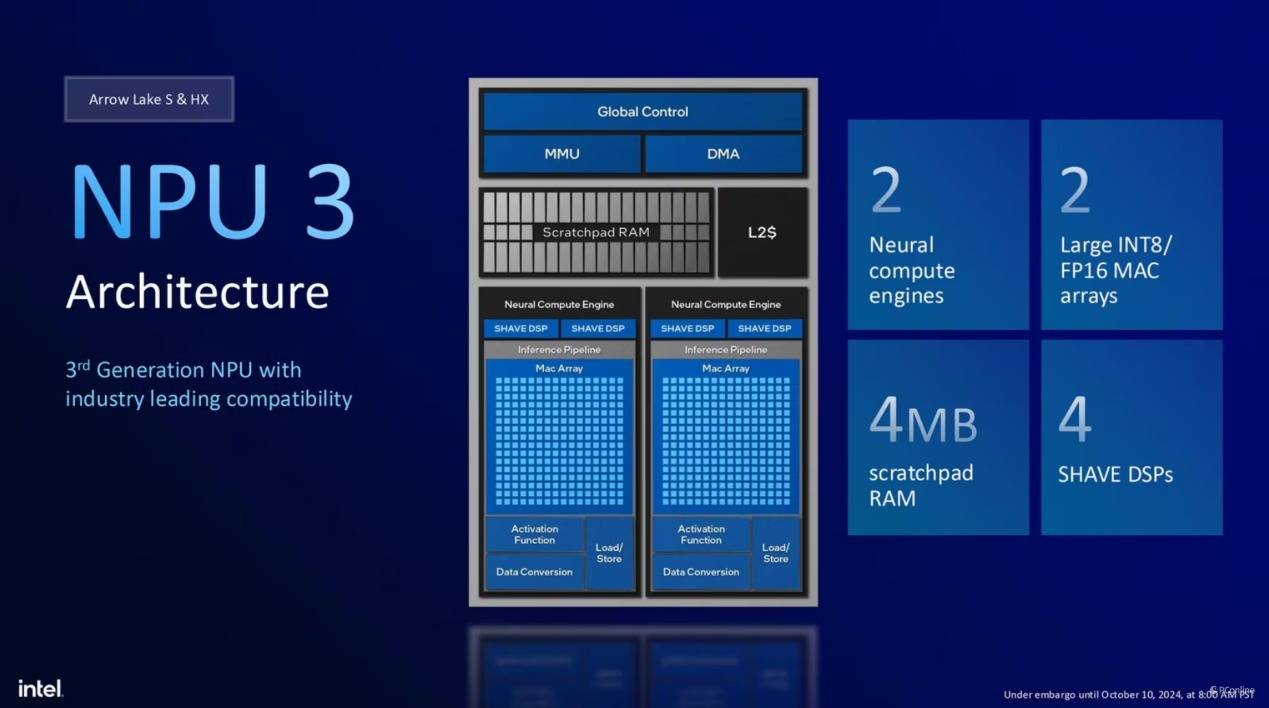 同时,这一代英特尔酷睿Ultra 200S系列桌面端处理器也像Lunar Lake一样,引入了NPU设计,不过其NPU为Meteor Lake中的第三代NPU,没有用上Lunar Lake的第四代NPU还是有点可惜。