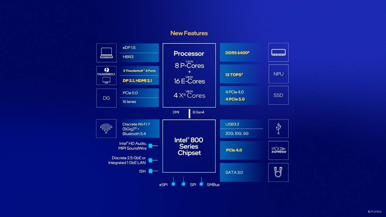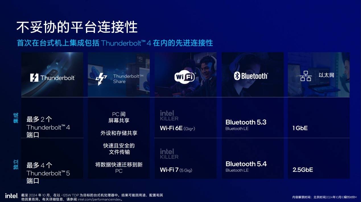 同时Z890芯片组还原生支持Wi-Fi 6E和蓝牙5.3,英特尔酷睿Ultra 200S系列则是支持最多2个雷电4接口。当然,如果追求更为极致的扩展性能,新平台还可以通过独立芯片,升级扩充最多4个雷电5接口、Wi-Fi 7、蓝牙5.4 以及2.5G以太网。