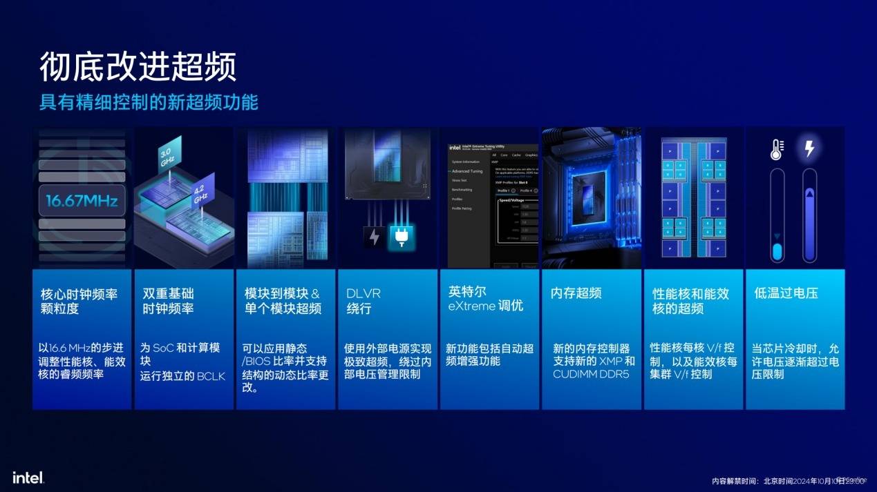 另外,酷睿Ultra 200S系列在超频上还做了不少改进工作,首先是16.67MHz核心时钟频率颗粒度,更细的颗粒度可以帮助玩家挤出每一丝的性能;其次是双重基础的时钟频率,SoC和计算模块将有独立运行的BLCK,玩家能够进行更细致的频率调整;同时这一代还加入了DLVR设计,每个核心都有相应的自己的电压控制,允许对每个性能核心和效率核心集群,也就是 E-Core 集群进行单独的电压调节,相比之前的产品,实现更精准、更精细的调节。在极限超频的时候,用户也可以绕过 DLVR,实现更极限的超频等。