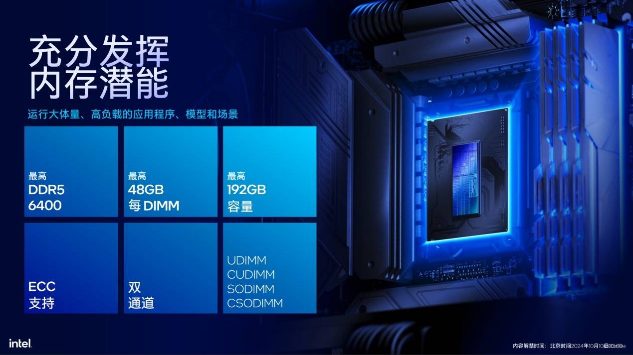 最后就是关于超频部分的提升了,新的酷睿 Ultra 处理器支持最新的高速 DDR5 技术标准,支持高达192GB 的DDR5 6400内存。而对于企业用户,ECC内存的支持也必不可少,同时这一代还支持新的DIMM技术,比如说UDIMM、CUDIMM、SODIMM以及CSODIMM,其中CUDIMM集成了时钟驱动器,不仅提升了内存的极限频率,还增强了系统的整体稳定性,让内存模块能够在更高频率下保持稳定的运行状态,据英特尔说这代处理器轻松上8000+MHz !