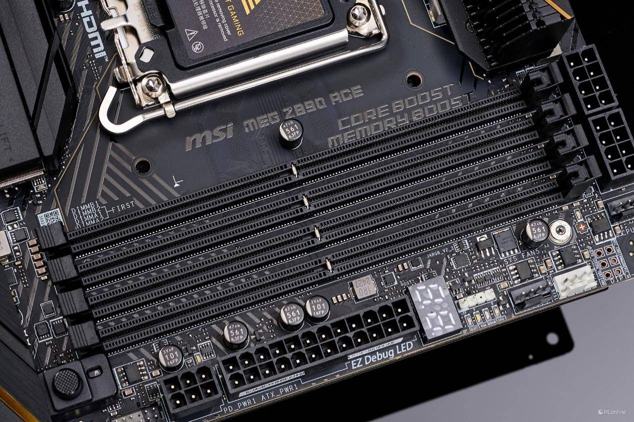 内存插槽则是常规的4槽设计,单槽容量最大支持48GB,插满共192GB,最高支持9066+MHz(OC),支持INTEL XMP3.0。并且微星主板针对内存还有专门的黑科技可用,如内存加速引擎,提供 Performance、Benchmark、Mentest 模式等三组优化预设,搭配自家Memory Try It!功能,可以更加方便进行内存超频,简直是小白的福音。