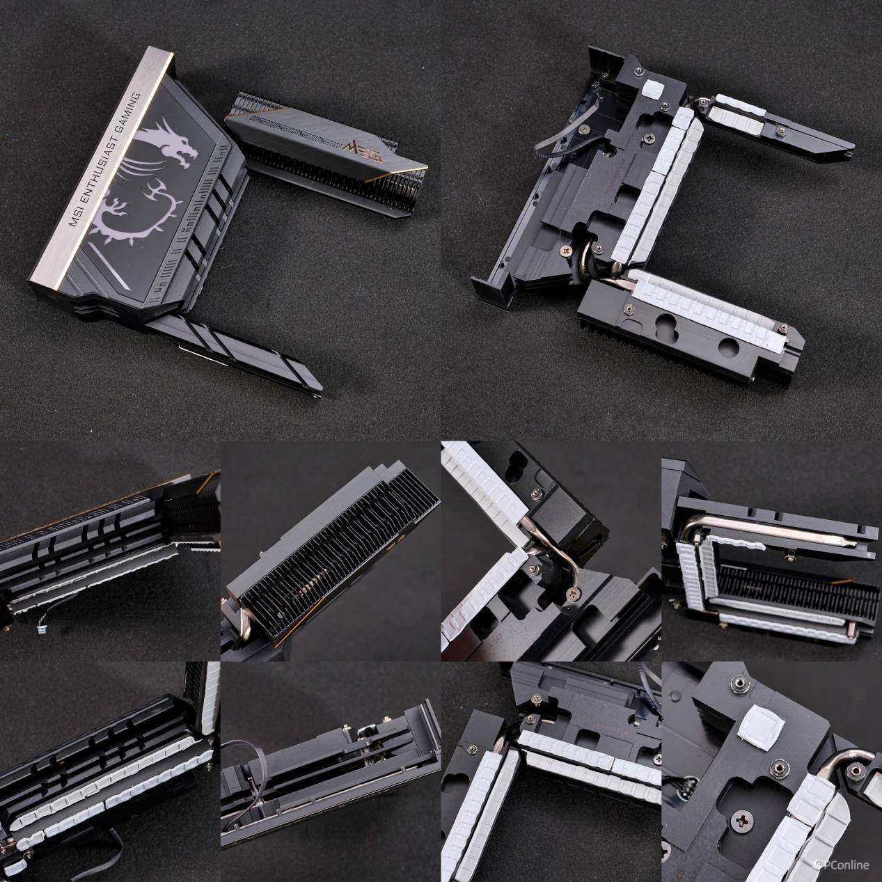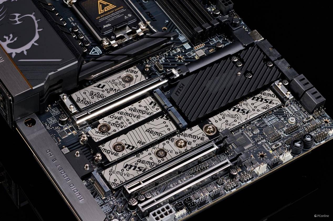回到主板,为了让供电能够全力输出,微星也是下更大功夫,首先便是给这款主板的VRM部分配上了超大面积的金属散热鳍片,采用HDT 直触式设计,直触供电模块,散热片更是厚达34mm,相当惊人。