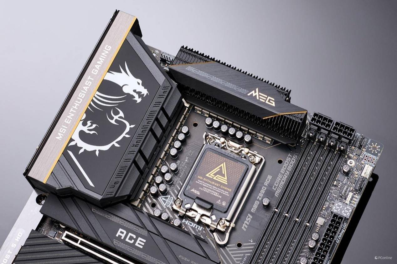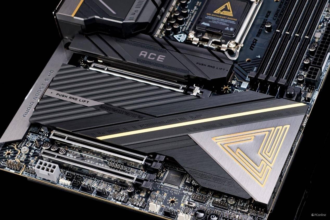 在设计风格上就能看出微星MEG Z890 ACE战神的奢华之处,依旧是低调沉稳的黑金配色,主板的装甲上印有巨大的微星龙标,并且大面积的使用斜切线条设计,整块主板从里到外都突出顶级旗舰的做工细节。
