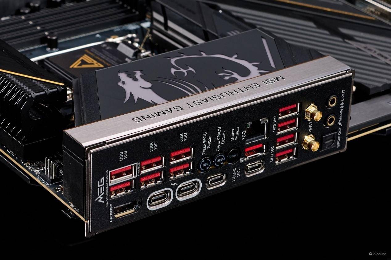至于接口方面,后置I/O部分提供了1个HDMI 2.1接口、2个雷电4接口(40Gbps,支持视频输出)、2个USB 10Gbps Type-C、10个USB 10Gbps Type-A、1个10G网线接口、WiFi 7天线接口、3.5mm音频口、光纤数字音频接口、重置CMOS按键以及BIOS更新按键和智能按键。