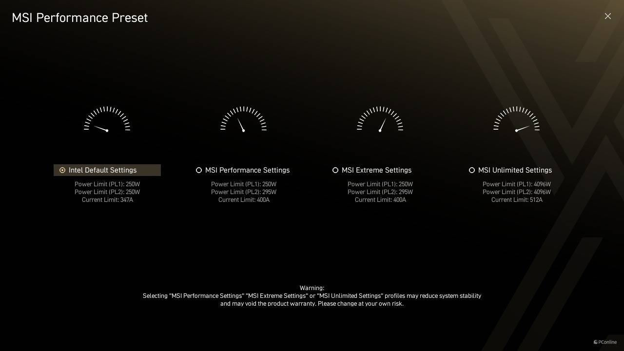 功能性上,这款主板为全新的酷睿Ultra 200S系列处理器提供了4种模式可选,即Intel Default Settings、MSI Performance Settings、MSI Extreme Settings以及性能释放最激进的MSI Unlimited Settings。